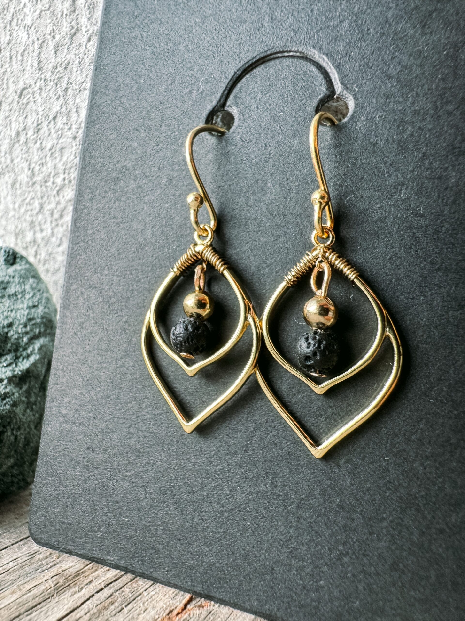 Modeschmuck aus: Edelsteinperlen aus Lawa dazu ein vergoldetes Charm „Blatt“